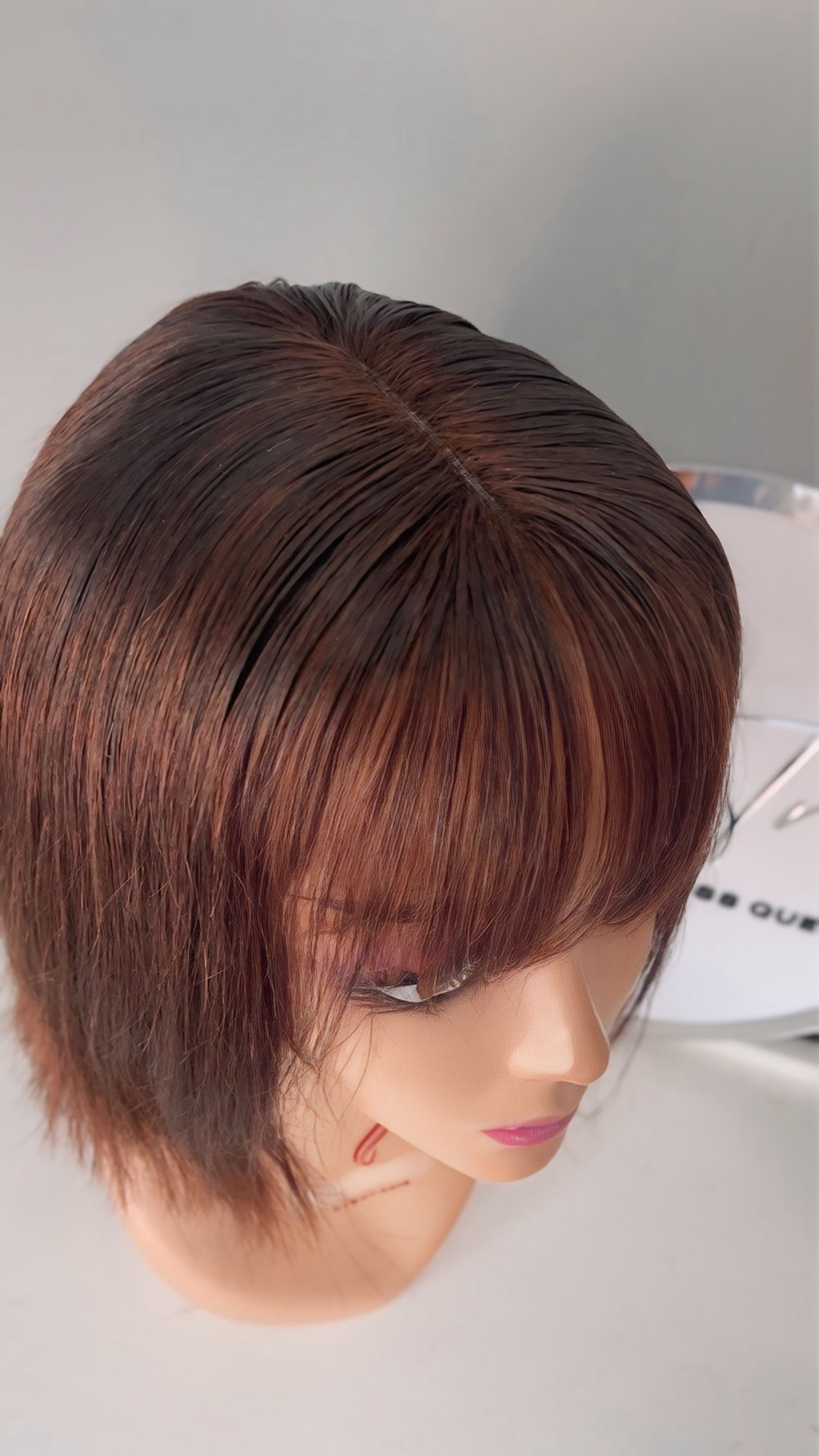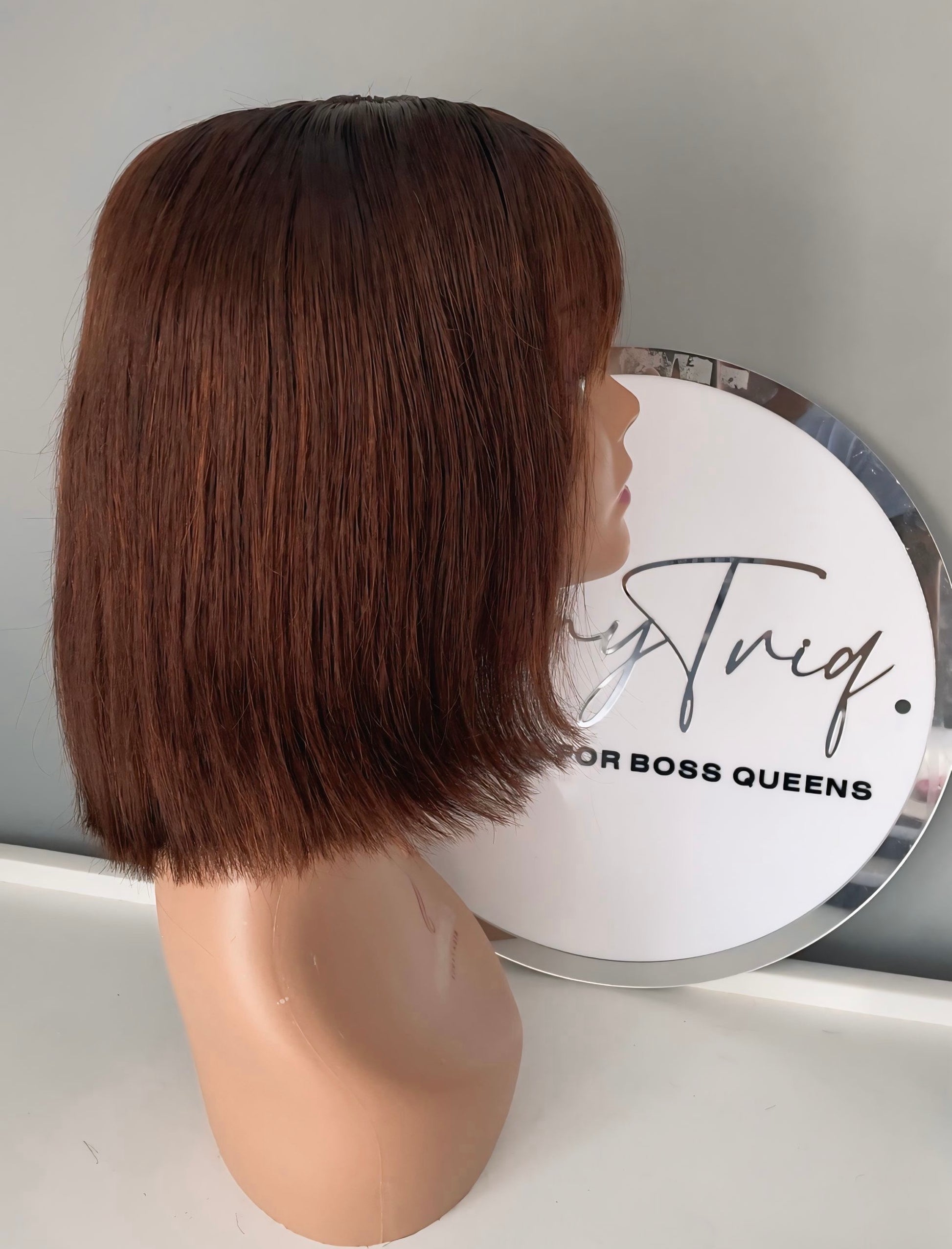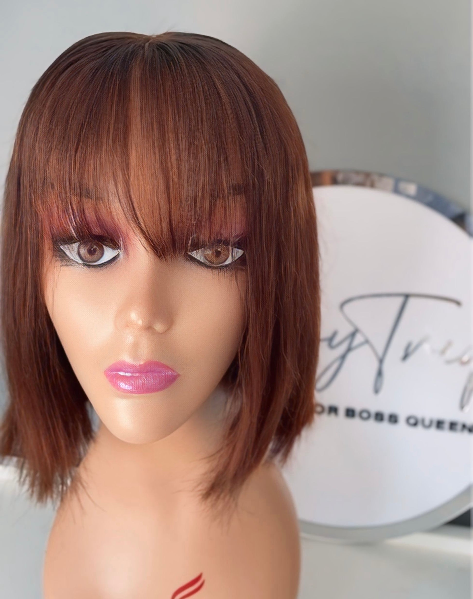 Transform your look with this sleek bob wig featuring a flattering fringe. Crafted for a polished, contemporary aesthetic, this style offers instant volume and dimension while maintaining a refined silhouette. The bang frames the face beautifully, creating a youthful, sophisticated appearance. Perfect for those seeking a versatile everyday style or a dramatic transformation without commitment. Easy to wear and maintain, this bob delivers salon-quality results with effortless elegance.